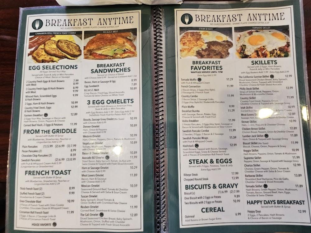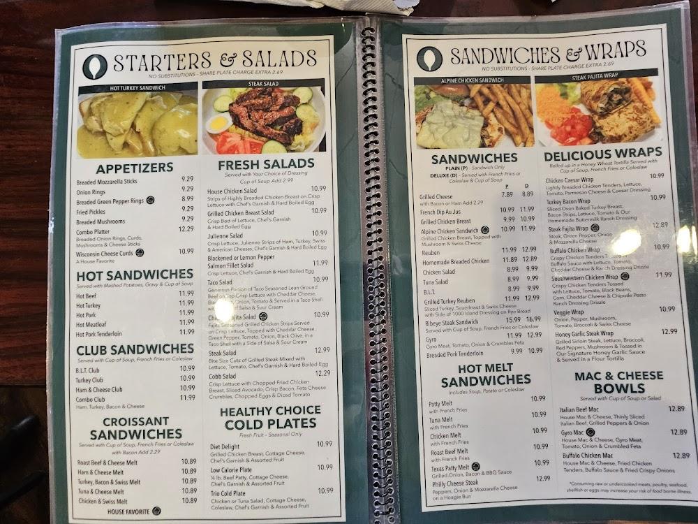 For lunch and dinner, guests can select from burgers, pasta, and hearty dishes. The ribeye steak and fried chicken are favorites. The casual yet satisfying menu also features tacos, wraps, and kid-friendly meals. Unique items like fish and chips stand out among traditional offerings.